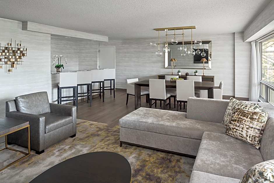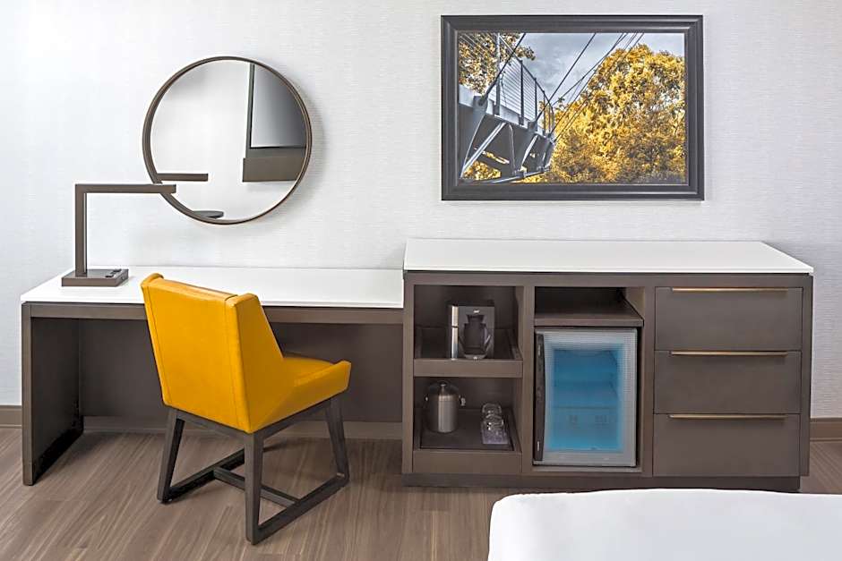 This suite features panoramic view of the Blue Ridge Mountains. A small refrigerator and coffee are provided as well. Guests will enjoy the comfort of a separate furnished seating area.
