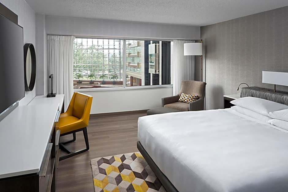 This suite features a view of the hotel's atrium. A small refrigerator and coffee are provided as well. Guests will enjoy the comfort of a separate furnished seating area and dining area.